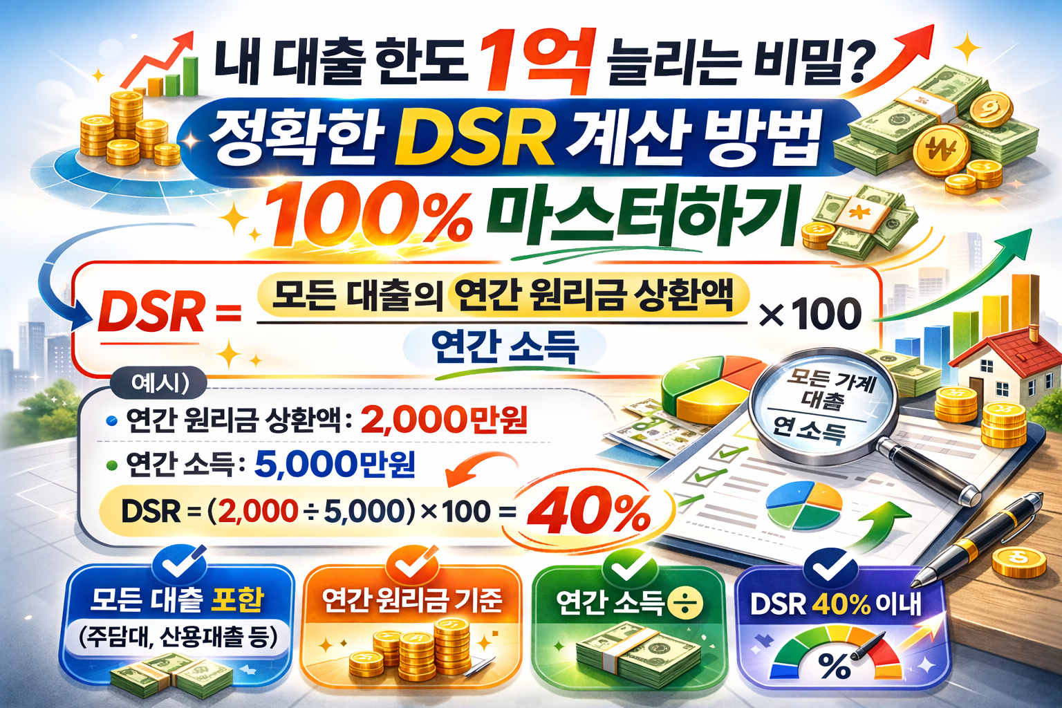- ✔ 모든 가계대출 원리금을 연 소득으로 나누는 DSR 계산 방법을 익히세요.